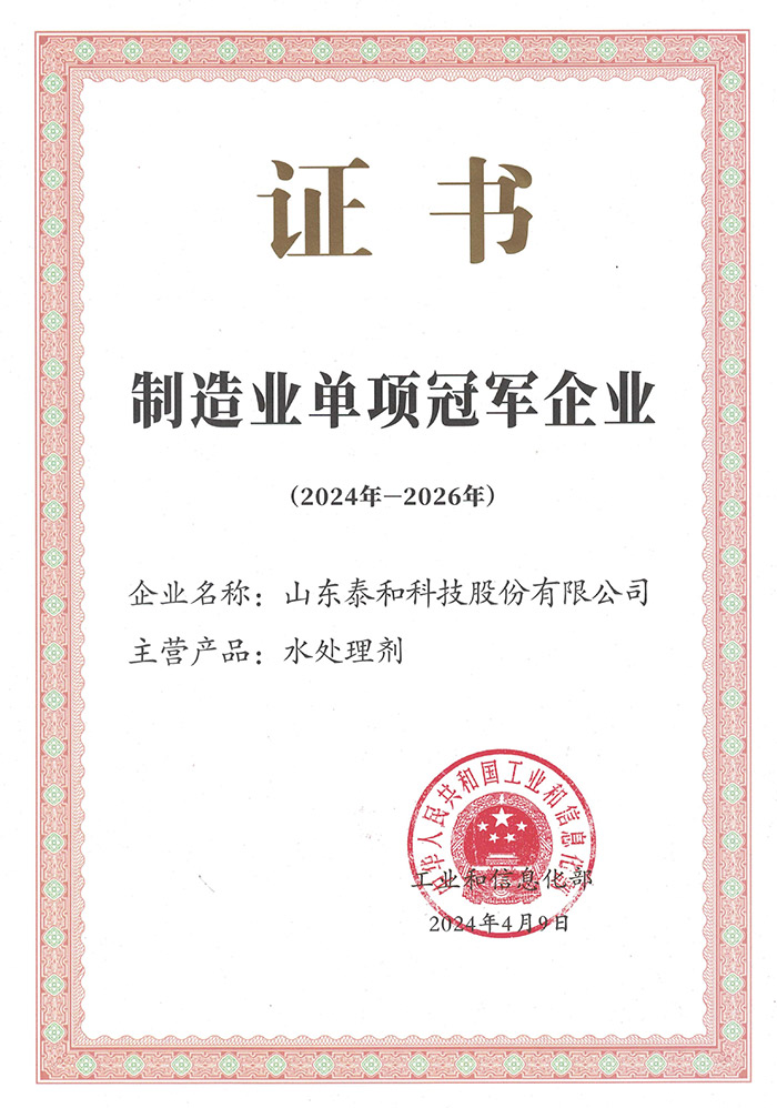 近日,泰和科技領到了國家工業和信息化部頒發的“制造業單項冠軍企業”證書,代表公司順利通過了復核。該稱號的延續不僅體現了泰和科技在水處理劑制造領域的卓越實力,也充分展示了公司在市場份額、創新能力、質量水平、品牌影響力等方面的顯著優勢。