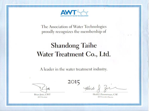 Shandong Taihe Water Treatment Technologies Co., Ltd., as the member of The Association of Water Technologies. (AWT) for several years, is entitled?A LEADER IN THE WATER TREATMENT INDUSTRY 2015.
